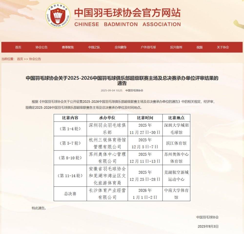 中国羽毛球协会官网截图。《晓谕》先容,2025-2026羽超联赛将分两个阶段进行,第一阶段永诀在深圳、杭州、苏州、芜湖举行,共14轮比赛。第一阶段名次前四名的球队,将于2026年1月1日至2日到长沙进入第二阶段的总决赛比赛。