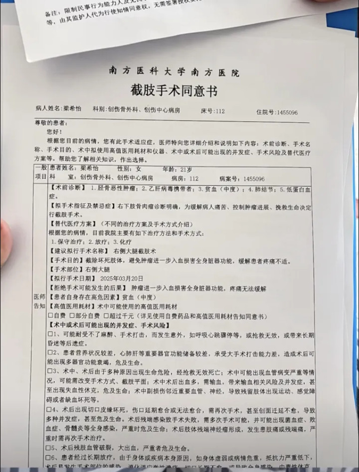 此前,3月18日,抗癌博主“勇敢饭饭”发视频称,“今天是我21周岁诞辰,我决定截肢了,并在本日签下截肢手术答允书”。