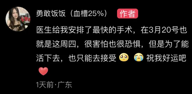 勇敢饭饭还在评述区回复:医师给我安排了最快的手术,在3月20号也即是这周四,很发怵也很恐慌,可是为了能活下去,也只可去经受祝我好运吧。