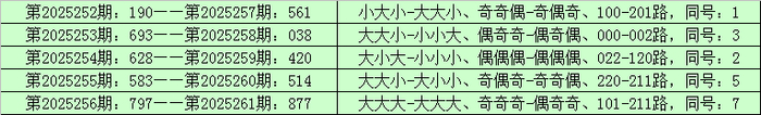 统计陈设三已开出的奖号发现,在蚁合5期(第2025252期-第2025256)奖号为:190-693-628-583-797。