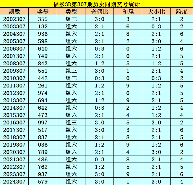 福彩3D积年第307期同时奖号为:355 132 936 598 640 749 843 551 442 261 974 694 642 473 997 517 837 036 789 486 762 937 579。