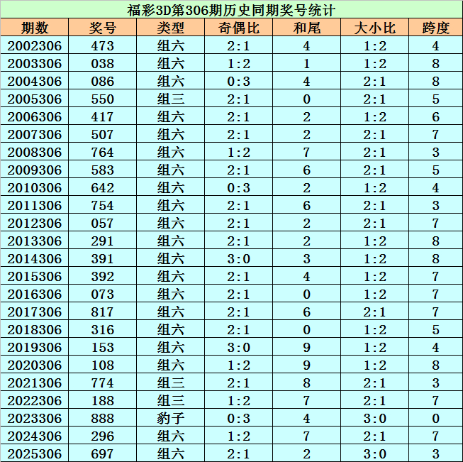 福彩3D积年第306期同时奖号为:473 038 086 550 417 507 764 583 642 754 057 291 391 392 073 817 316 153 108 774 188 888 296 697。