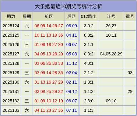 前区重号分析:上期未开出重号,在最近15期中出现5期重号,出现概率为33.33%,本期看好不开出重号。