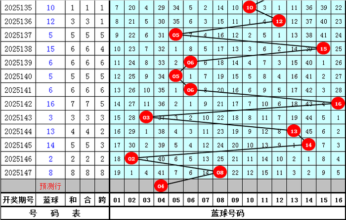 双色球第2025147期奖号为:01 03 05 08 22 33+08,红球号码012路比为2:2:2,蓝球为2路号码。