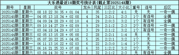 大乐透第2025148期奖号为:03、04、14、30、32+08、12。其中前区三区比为2:1:2,大小比为2:3,莫得出现重号,包含连号,后区为全偶号码。