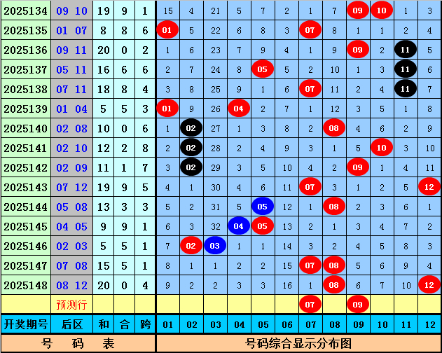 前区连号分析:上期前区包含连号,最近10期包含连号的奖号有5期,连号走势较冷,本期宽恕连号出现,参考连号09、10。