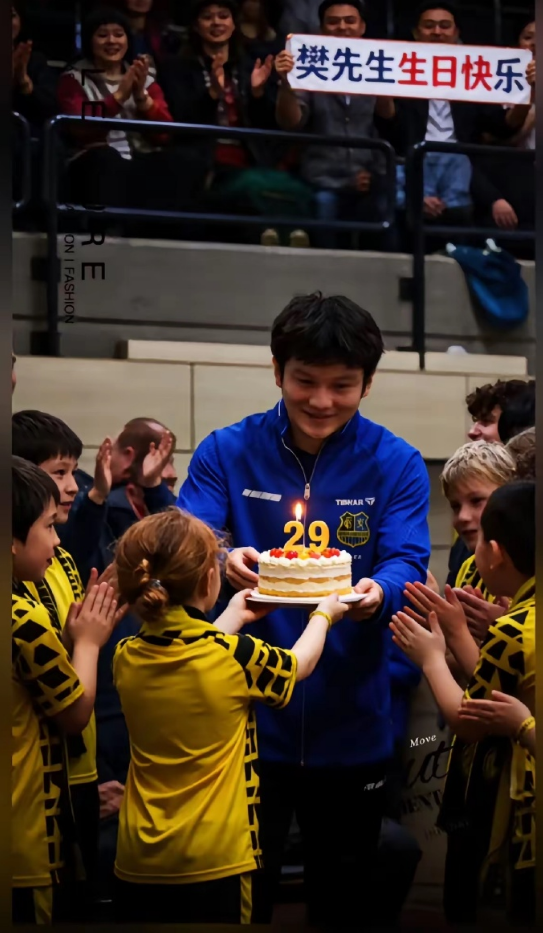 网友晒出视频,在前几日的德甲赛场,球迷在赛后提前为樊振东29岁生辰庆生。
